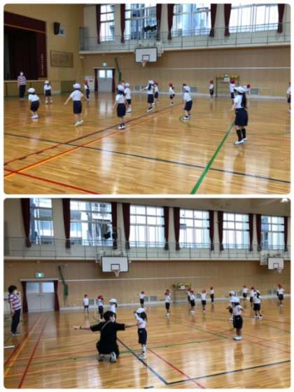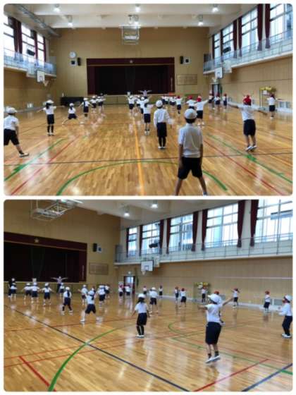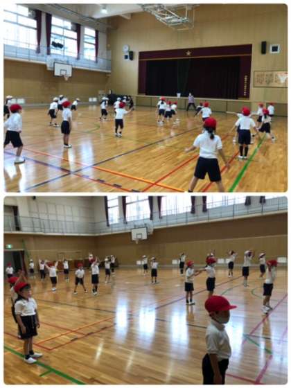続いて2時間目は1年生が講堂で体育をしていました。体操をしていましたが、両腕を広げたり、跳んだりとどんな動作も楽しんでいました。