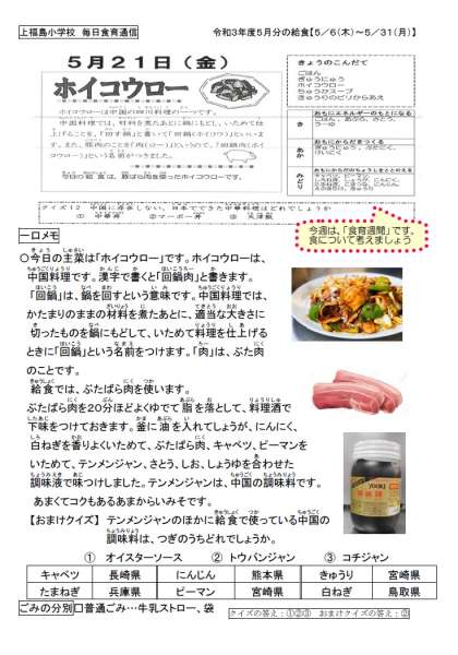 給食の「ホイコウロー」は、テンメンジャン等で味つけしています。