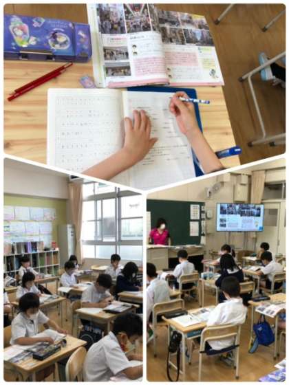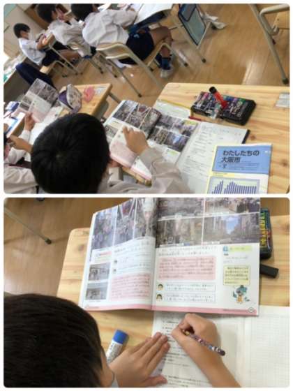 3年1組は、社会科の学習をしていました。店の多い街の様子について、教科書を繰り返し読んだり、ノートを見返したりしながら一生懸命課題に取り組んでいました。