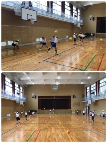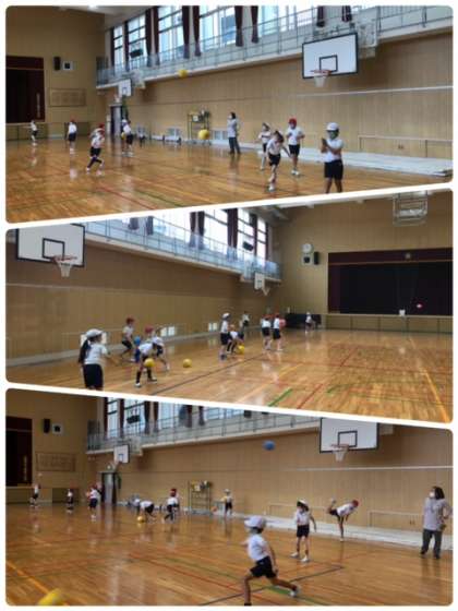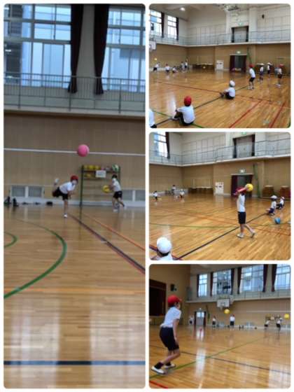 3年生が講堂でボール運動をしていました。小さな手でボールを投げるのは大変なようでした。また、思うような方向に投げられず苦戦していた子どももいましたが、友だちにコツを教えてもらい、上達した子もいました。