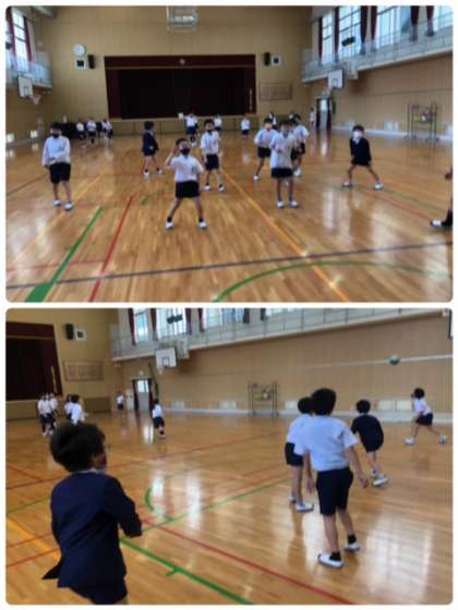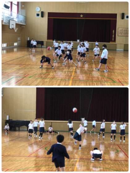 講堂では、4年生が仲良く男女に分かれてドッジボールをしていました。互いにハッスル、ハッスルでした。
