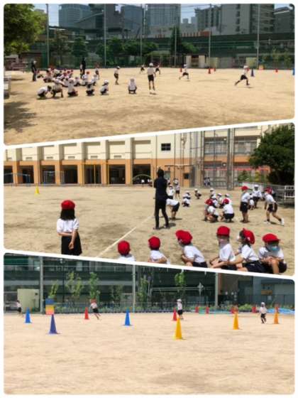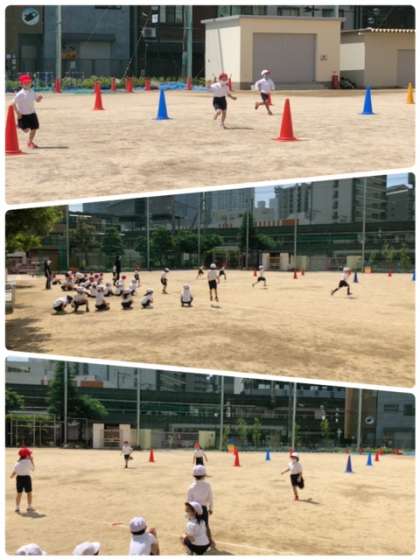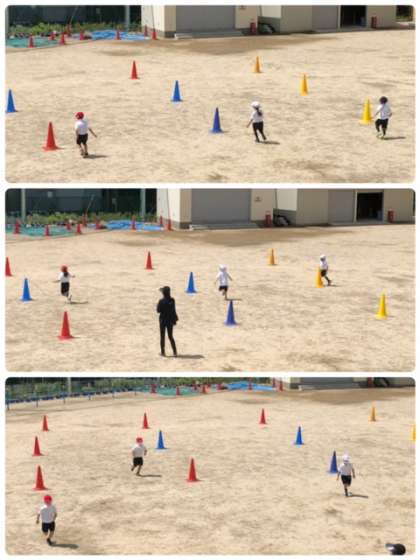 1年生が運動場で体育をしていました。ジグザグに走ったり、コーンの周りを回ったり、横向きに走ったりと、いろいろな走り方で楽しく学習していました。