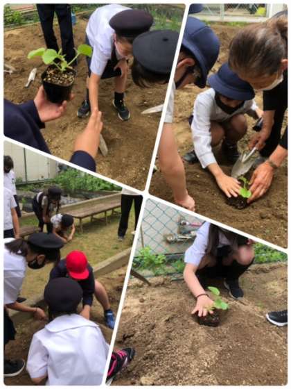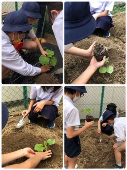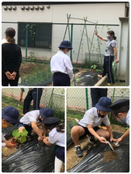 3時間目、4時間目に4年生がなかよし畑でなにわの伝統野菜を植えました。今日は、毛馬きゅうり、玉造黒門越瓜を植えました。こちらも、大きく成長したらお漬物にしていただきます。