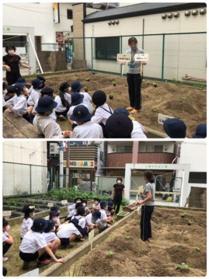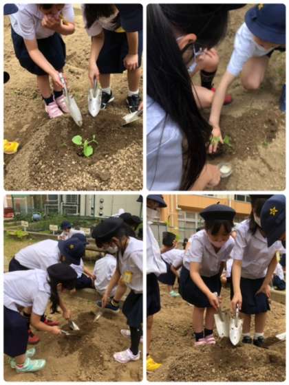 5時間目は、3年1組がなにわの伝統野菜、毛馬きゅうりと玉造黒門越瓜を植えました。