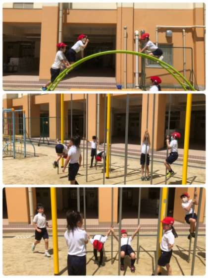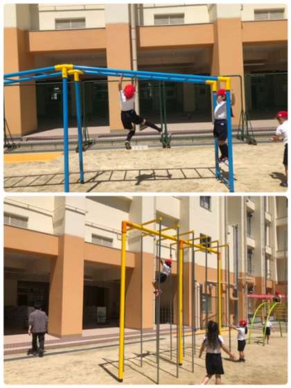 2年生が、照りつける太陽の下で元気に鉄棒と、機械器具を使っての授業をしていました。鉄棒にぶら下がったり、雲梯をしたり、登り棒をよじ登ったりしていました。
