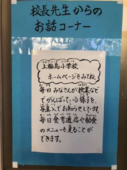 今日は月曜日なので、放送朝会でした。校長先生から、「1人1台学習者用端末では、You Tubeなどの学習に関係のないものは見ないこと、逆に上福島小学校のHPは、ぜひ見てください。」とお話がありました。保護者の皆様も、ぜひ1日1度HPをご覧ください。