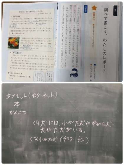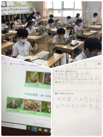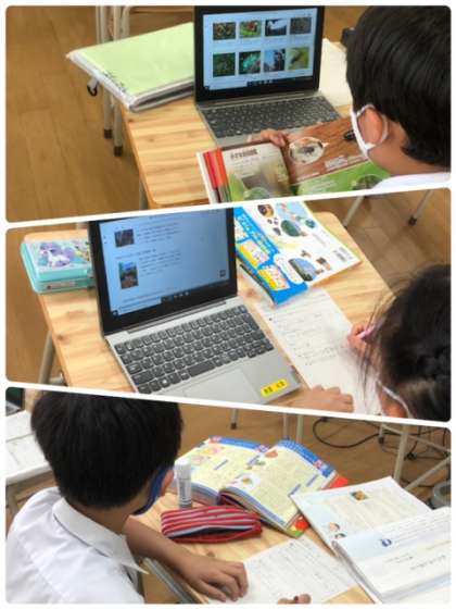 3年生が国語の学習で、レポート発表をするための原稿づくりをしていました。内容を1人1台用PCを使って調べている児童、図鑑などを使って調べている児童など様々です。