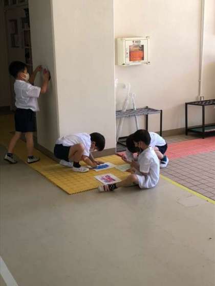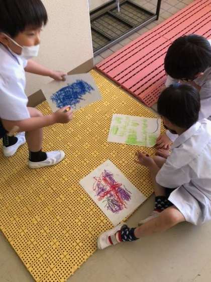 クレヨンやパスとなかよしという題材で、廊下の壁やピロティのタイルなど、ボゴボコした面に画用紙をおき、パスでこすっていました。いろいろな模様が出てきました。