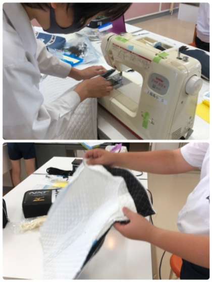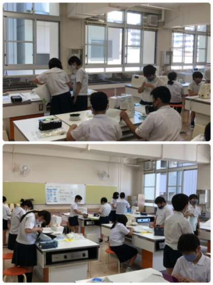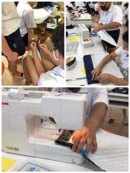 6年生はナップサック作りに悪戦苦闘。ミシンを使うのも大変。でも、完成目指して頑張ってます。