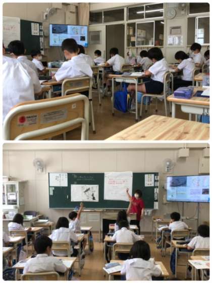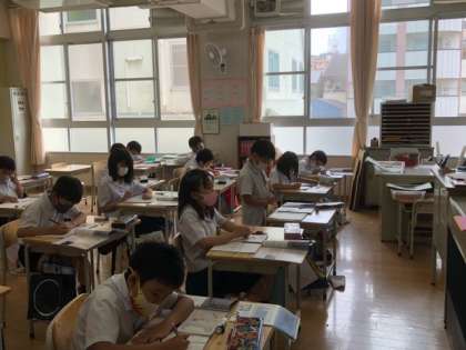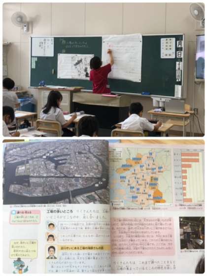 今日も社会科で、大阪市の学習をしっかりとしています。教科書をよく見て、ワークシートに答えを書いています。