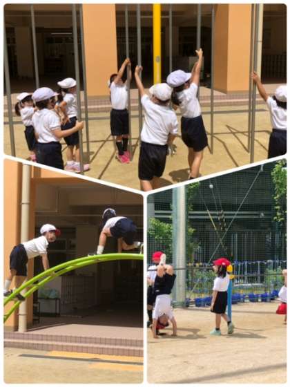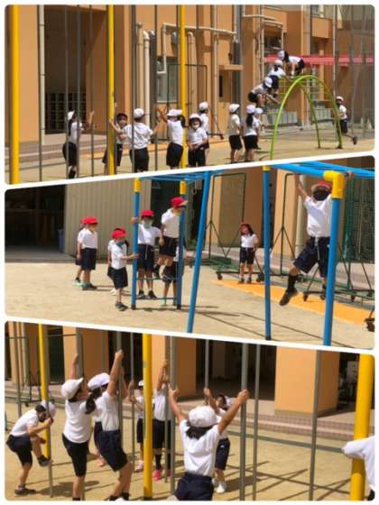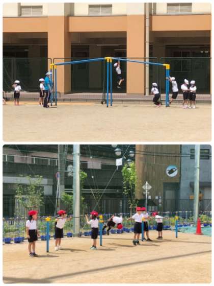 1年生は、鉄棒や登り棒、雲梯をしました。何とかして登ってやろう、あっちまで渡ってやる。そんな意気込みを感じました。