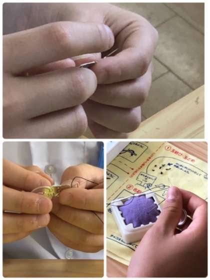 5年生の家庭科は、前回に続き裁縫です。今日は、糸通しの便利さにびっくり。その後は、練習布に、自分の名前を縫っていましたが、こちらも苦戦を強いられていました。