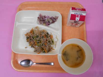 今日の給食は「豚ひき肉とにらのそぼろ丼、牛乳、みそ汁、キャベツの赤じそあえ」です。