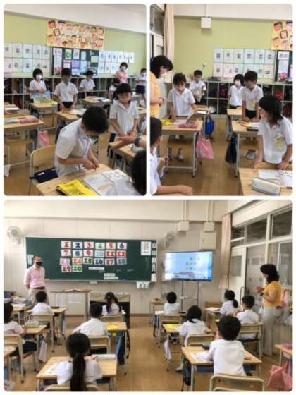 3年1組は、リン先生、室先生にお越しいただき外国語活動の練習。How many apples do you have?とお家でも聞いてみてください。