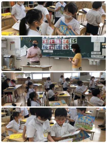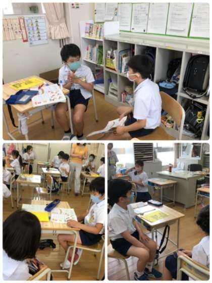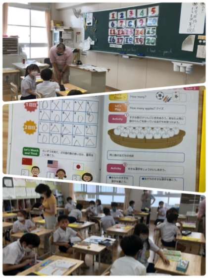 3年1組に続き、3年2組も、リン先生、室先生にお越しいただき外国語活動の練習。How many apples do you have?とお家でも聞いてみてください。