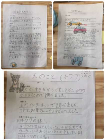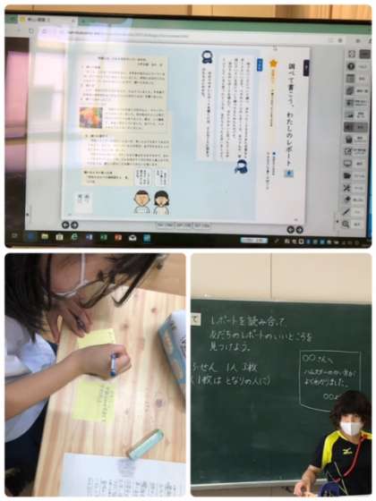 3時間目に、3年1組では国語科の授業で作成したレポートについて互いに感想を書いて、友だちの良いところを伝え合っていました。出来上がったレポートは、どれも力作ぞろいです。