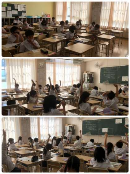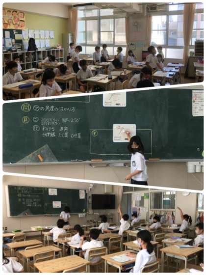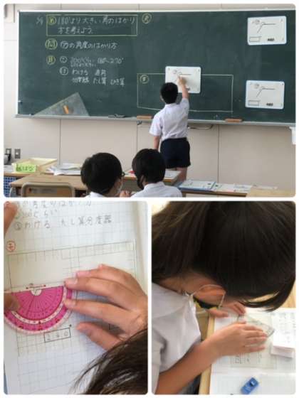 4年生の角度の学習です。分度器を使ったり、式で考えたり答えに辿り着くため、いろいろと考えていました。発表する祭も、根拠を示して説明できていました。