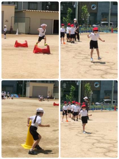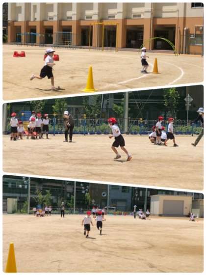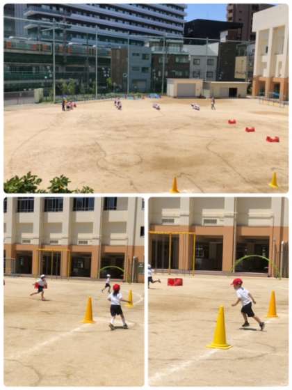 運動場で、1年2組が体育をしていました。時折、日陰で休憩しながら運動場に引かれた水線やコーンの上を、走ったり、飛び跳ねたりと軽快に走っていました。