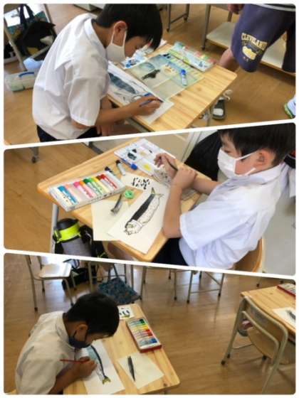 昨日の続きで、あの魚を描いています。色使いにも注意しながら、丁寧に丁寧に仕上げていきます。とてもいい作品ができました。