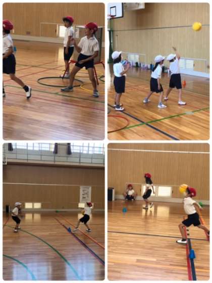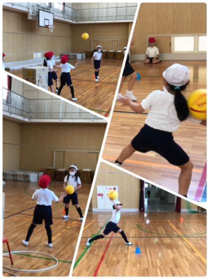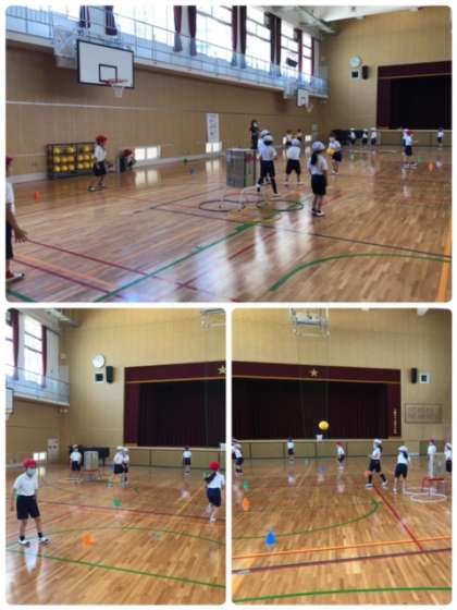 講堂での的当て。攻守分かれて互いに頑張っています。的に当たる回数も増えてきました。