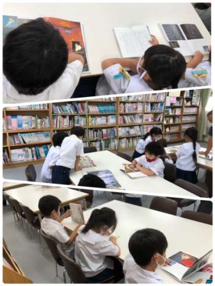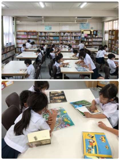 3時間目。運動場でしっかりと汗をかいた1年1組の皆さんが図書室に来ました。借りていた本を返却した後、それぞれに読みたい本を熱心に読んでいました。