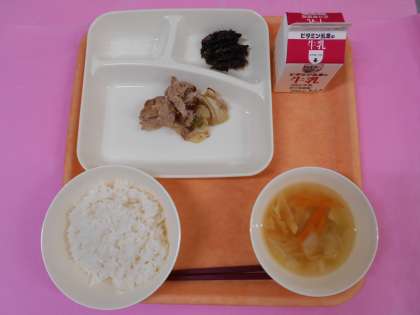 今日の給食は「ごはん、牛乳、豚肉のごまみそ焼き、すまし汁、のりのつくだ煮」です。