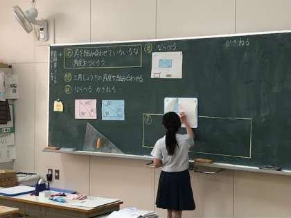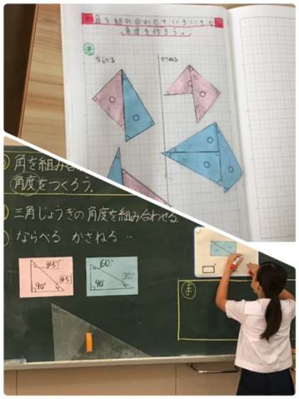 今日は、三角形の角を組み合わせていろいろな角を作っていました。作業に集中。そして、しっかり発表。すごいです。