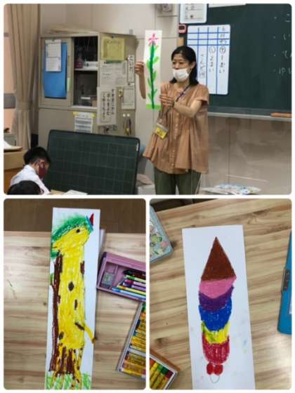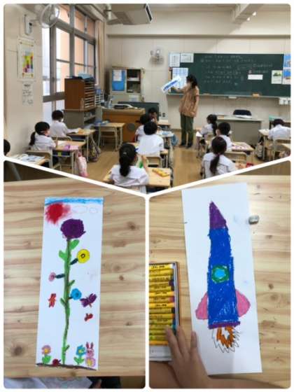 クレパスを上手に使って、長い画用紙に絵を描いていました。ロケット、キリン、花。長い画用紙の特徴を生かした作品がたくさんです。