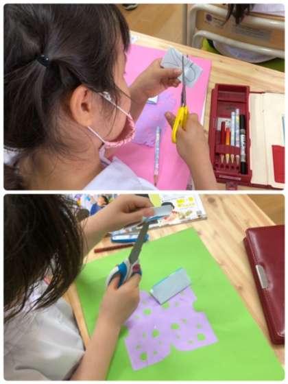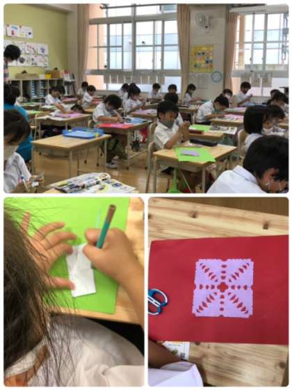 3時間目。1年1組では、「チョッキン パッ でかざろう」と題して、つながる形を作り色画用紙に貼っていました。おもしろい形がたくさんできていました。