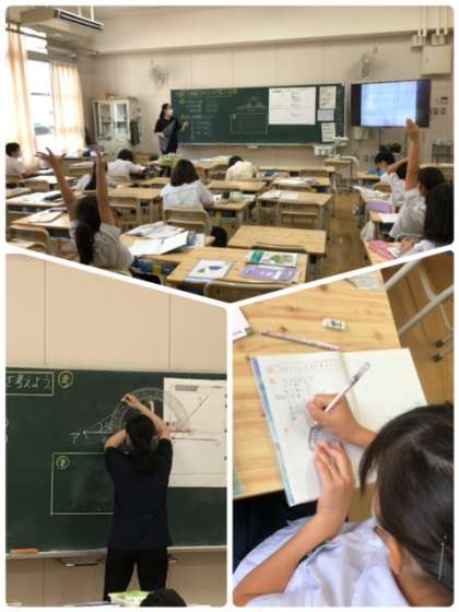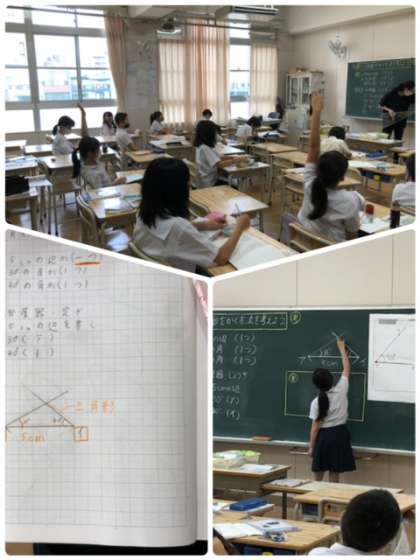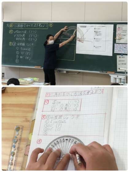 分度器の使い方も上手になりました。必要な場所の条件がわかれば分度器を使って三角形が描けるようなりました。手の挙げ方が、自信のあらわれです。