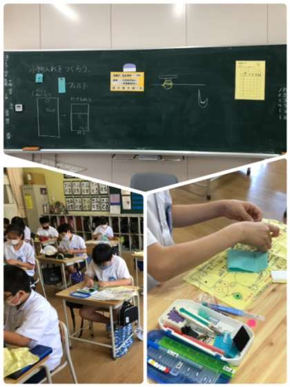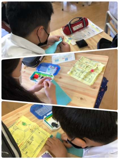 5年生が先日のボタン付けを生かした小物づくりに取り組み始めました。目は真剣。ゆっくり、丁寧に作業にあたっています。