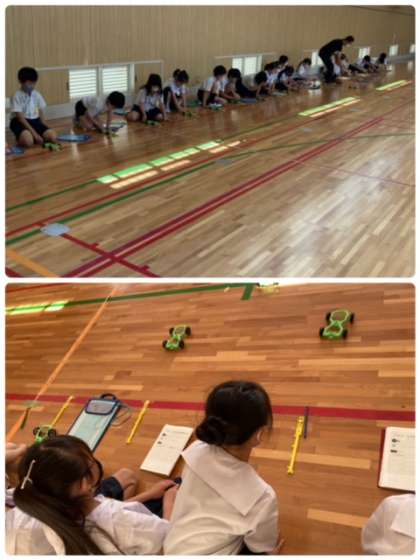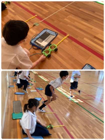 風の学習が終わり、今回は同じ実験キッドを使ってゴムの学習です。車はどこまで飛ぶのか?楽しそうですね。