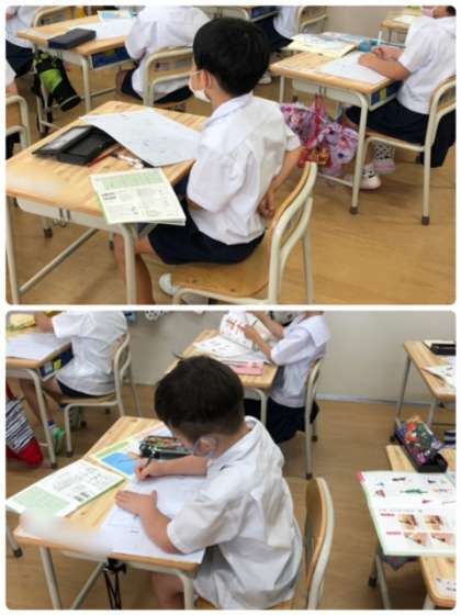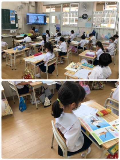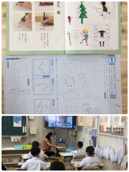 1年生の教室を覗くと、お腹や背中に拳を当てている子どもがたくさんいます。どうしたのかな?覗いてみると、書写の学習でした。姿勢よく、紙を押さえて丁寧に書いていました。