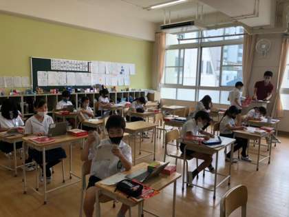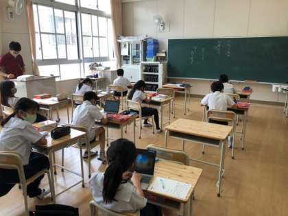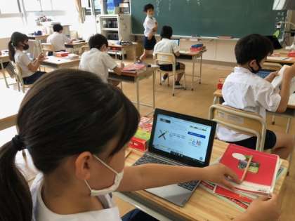 4年生が、国語科の学習でことわざを調べていました。辞書を開いて調べたり、1人1台PCを使って調べたりと、アナログとデジタルを上手に使い分けています。