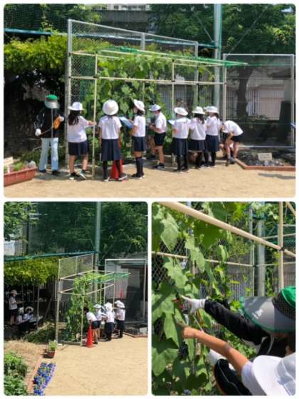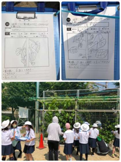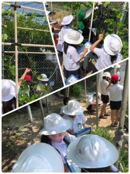 学習園に植えた、へちまがどんどんと伸びています。今日は観察に行き、スケッチしましたが、前回より何メートル単位で成長しておりびっくりしていました。