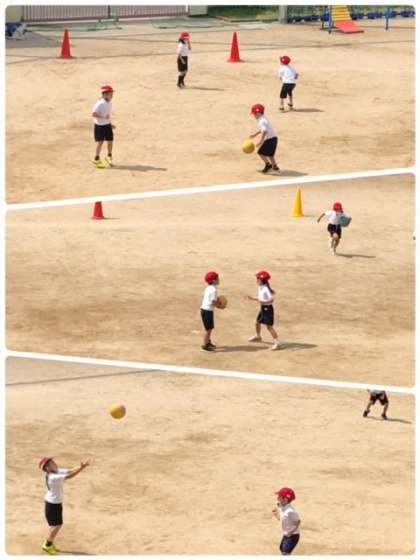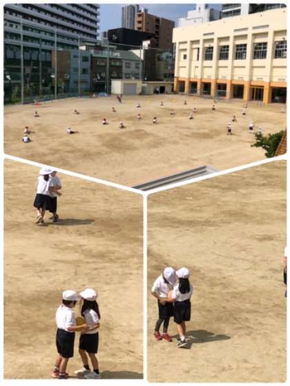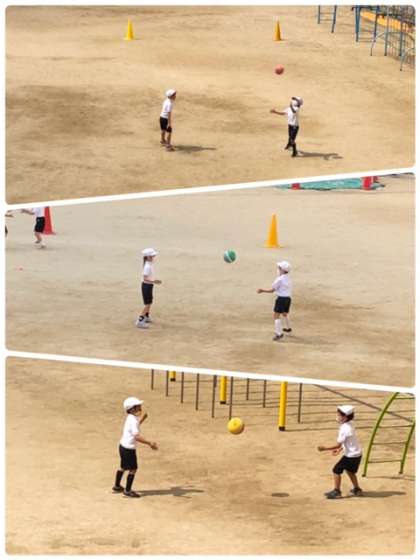 1時間目、運動場で1年生がボール遊びをしていました。投げ合ったり、一緒に挟んだりと色々な方法でボールを運びました。