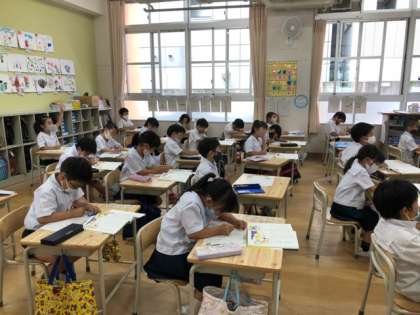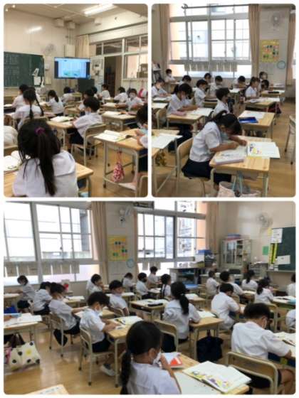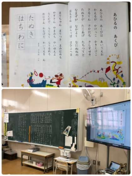 国語の学習で、50音を使ってのことば遊びをしていました。「ありさん あいさつ あいうえお」など自分たちでさの創作で、おもしろい作品ができていました。