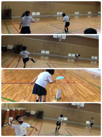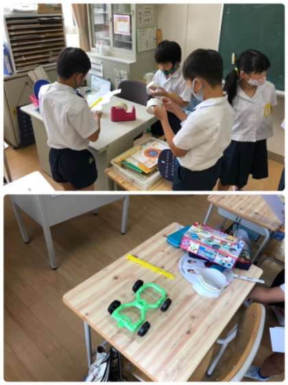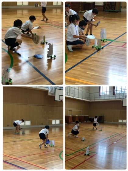 3年生風の学習のまとめは、風で動くおもちゃで遊ぶこと。講堂で力一杯紙の輪を投げたり、車を団扇で動かしたりしました。