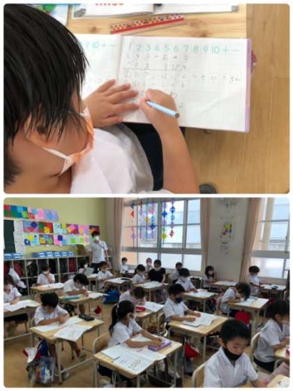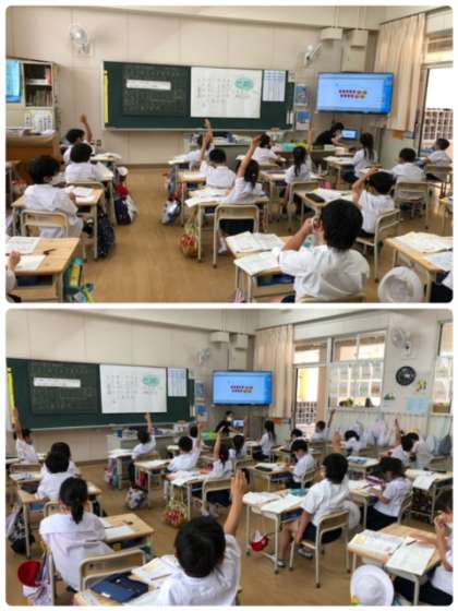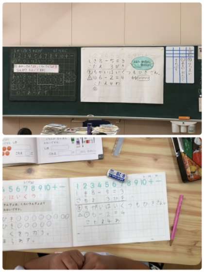 昨日の算数科の授業に続き「ひき算」の学習です。ひき算よりも「なんこ少ないですか?」と言う問いかけが難しいようです。