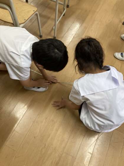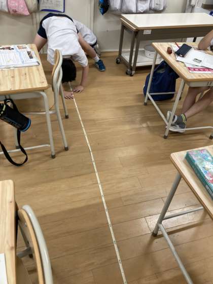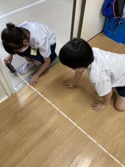 先日の長さの学習の続きで、巻尺の使い方を学習しました。昨日はちゃんとわからなかった教室の長さが今日はわかったようです。