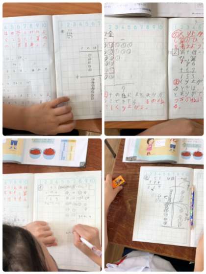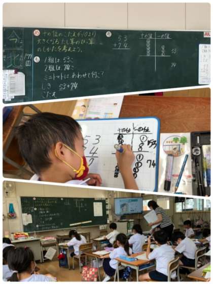 こちら2年生では、2桁どうしを足しています。今までに習ったことのない問題に、絵や図を用いて課題解決にあたっています。