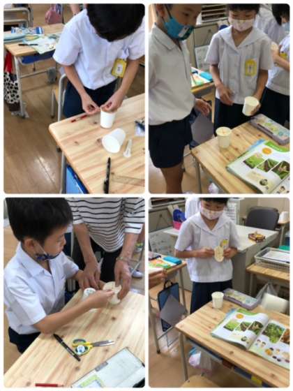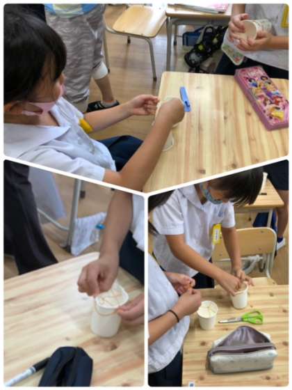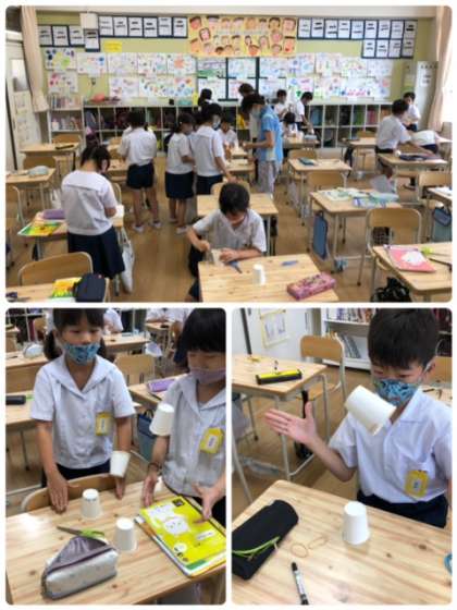 理科のゴムの学習を生かして、紙コップと輪ゴムでおもしろいものを作りました。どれもよく跳んでいます。