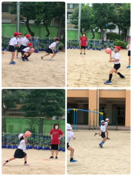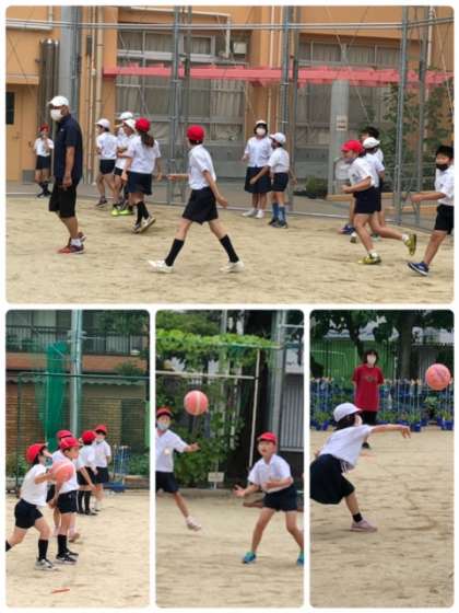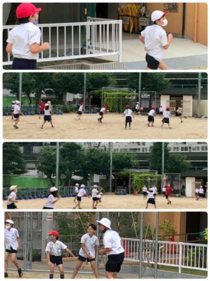20分休みよ運動場では、3年1組と5年生が先生と一緒にクラス遊びをしていました。楽しそうで白熱している様子です。