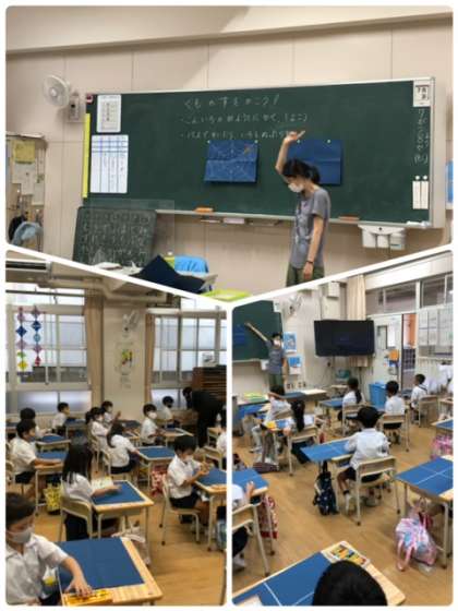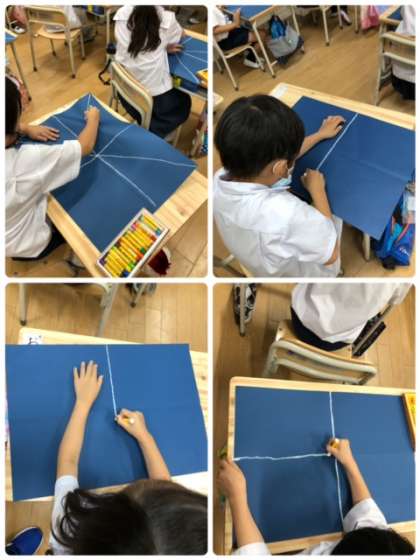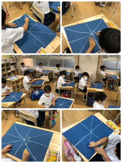 図工の時間です。紺色の画用紙に、白のクレパスでクモの巣を描き、そのクモの巣の上に、いろいろな物を描いていきます。さぁ、どんな作品ができたのでしょうか?乞うご期待!