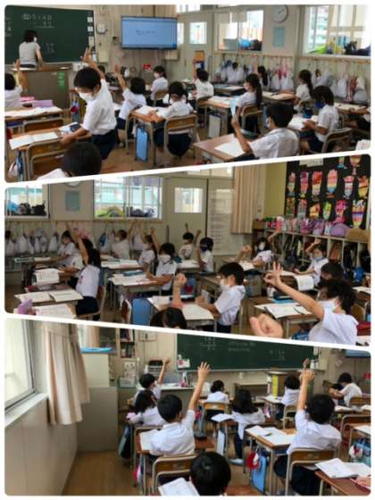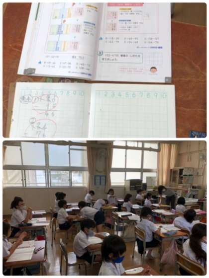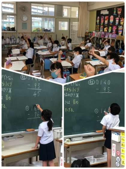 くり下がりが2回もあるひき算ですが、みんな頑張って問題に取り組んでいます。前で説明する児童も、堂々とした態度に自信を感じました。みんなもハンドサインで意思表示をしていました。