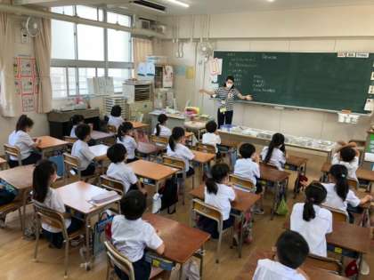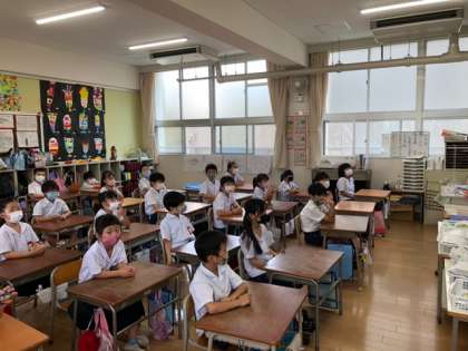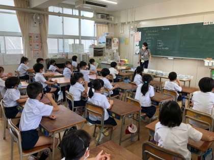 2時間目に、2年2組が1年2組を案内する学校探検が始まります。教室で最後の確認をしています。