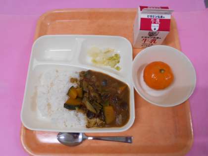 今日の給食は「夏野菜のカレーライス、牛乳、キャベツのサラダ、みかん(冷)」です。