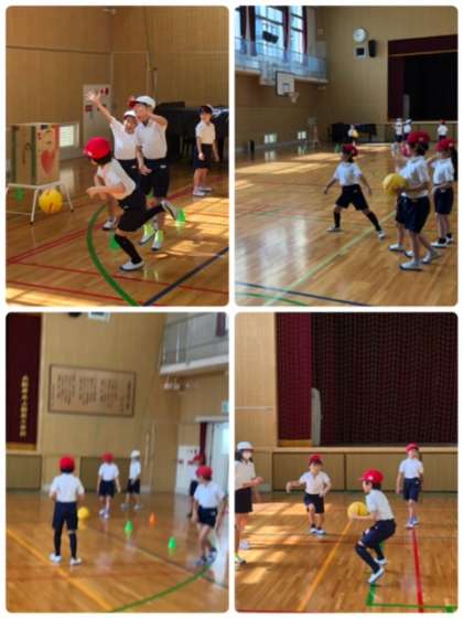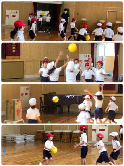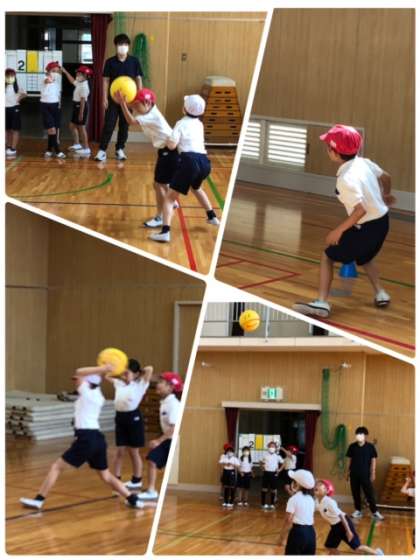 今日も、的をめがけてボールを投げます。チームで協力してパスを回して、的に近づいて行きます。