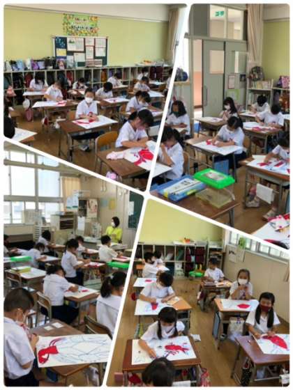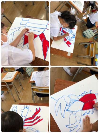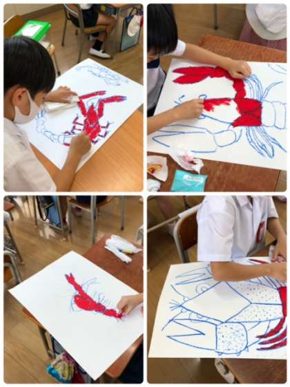 図工科の学習で、クラスでお世話をしてきたザリガニを描いています。画用紙いっぱいに描かれたザリガニは実にワイルド!完成が楽しみです。