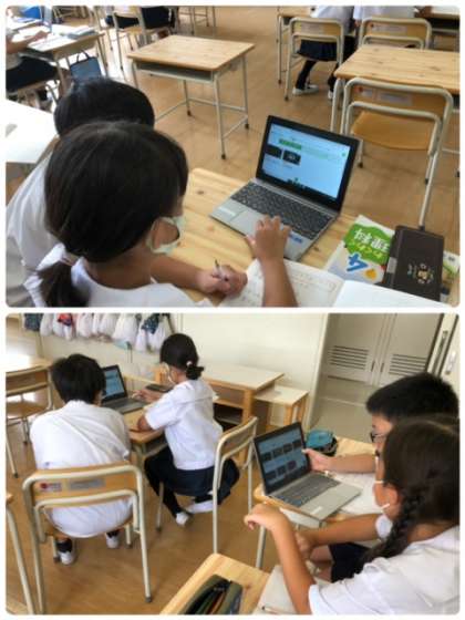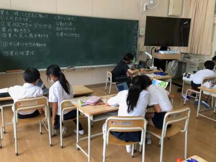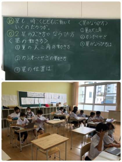 4年生が1人1台用PCを用いて、自分たちで夏の大三角やカシオペア座の動き方を調べています。